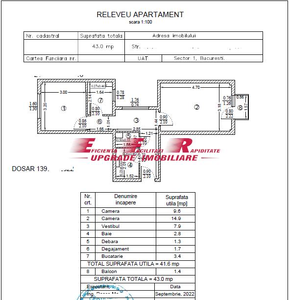 EFR UPGRADE IMOBILIARE va ofera spre vanzare apartament de 2 camere, confort 1, decomandat, suprafata utila 41.6 mp (plus 1.4 mp balcon), vedere mixta, situat la etaj 5 din 10 , cu balcon inchis si refacut cu sistem de geam termopan similar cu tamplaria exterioara, si cu baie cu cada construit in 1976 in zona Dorobanti, ideala pentru locuit sau business, cu acces de pe strada cu trafic redus. Finisaje si imbunatatiri: parchet quick step Belgia, faianta, tamplarie pvc cu geam termopan, plase de tantari, contorizare separata, inclusiv cu autocitire. Bucatarie mobilata si semiutilata, interfon, aer conditionat. Raman in apatament frigider, aragaz, masina de spalat, mobilier. Blocul a fost inscris in programul de izolare termica pe exterior si s-a finalizat modernizarea de cativa ani. Disponibilitate imediata. zona PERLA-Stefan cel Mare. Aproape de metrou, transport in comun de suprafata, supermarket, farmacie, scoala-liceu. Pozitia acestui apartament este deosebita, faciliteaza acesul la mai multe parcuri in timp scurt. Vizionarea se face pe baza incheierii unui contract de vizionare si comision si se programeaza cu 48 de ore inainte (minim).